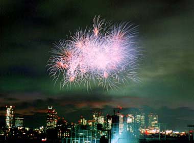 川原・海辺で見物するのが常識だった花火を、ゆったりと座ってナイター気分で楽しんでしまう。 |