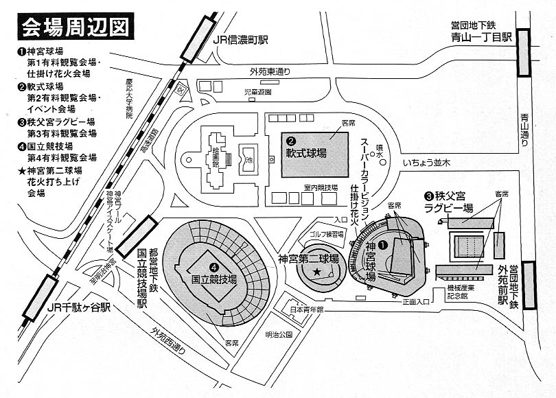 | 1)神宮球場 | 花火大会のメイン会場。ゆったりと座りながら花火が見えます。 全席指定、1週間で完売しましすので、場所は選べませんがアリーナ席かスタンド席ファースト・ライト間の上部席がおすすめ。スタンド席前列は金網があり少し邪魔となります。 この会場でナイアガラの仕掛け花火が行われます。 |