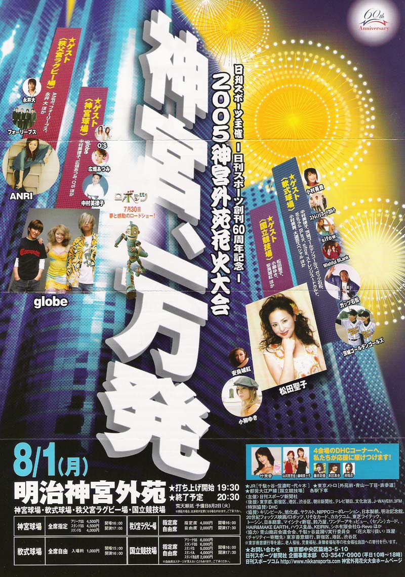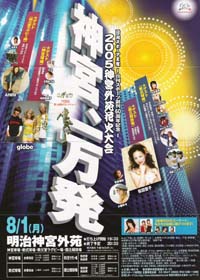 今年有料指定席が出来ました。それ以外は有料自由席で、打ち揚げ場所を中心として、神宮球場の反対側に位置し、迫力の花火が楽しめます。イベント盛りだくさんで、スペシャルゲストが登場します。 |