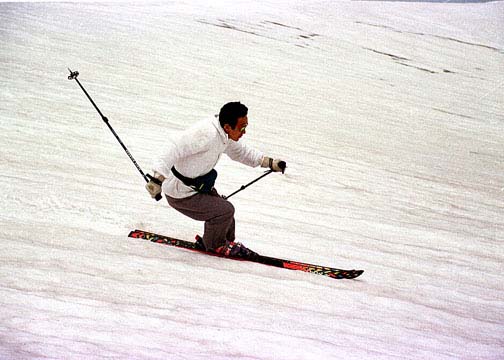 ひゃっほー。山頂に荷物を置いての滑走です。